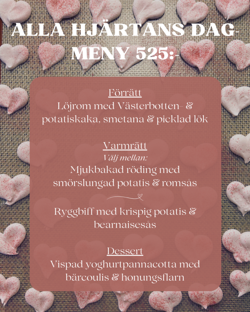 - 14/2 – ALLA HJÄRTANS DAG – Vi serverar A la carte och en trerätters alla hjärtans-meny