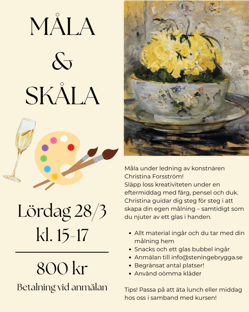 - 28/3 – Måla och skåla med Christina Forsström. 800 kr ink. bubbel, tilltugg, material. 15-17. Anmäl till info@steningebrygga.se