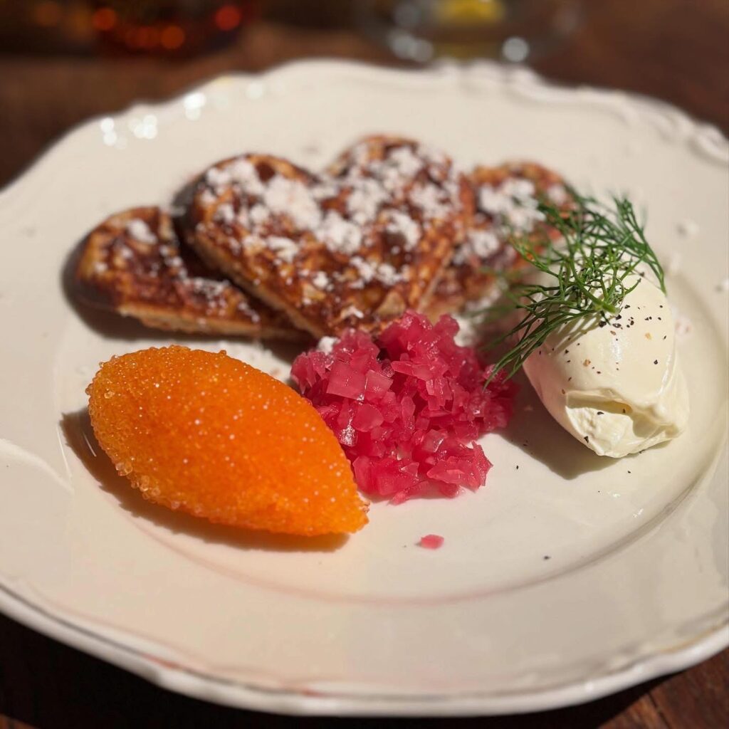 • Löjrom med västerbotten- och potatiskaka, smetana, lök – 175