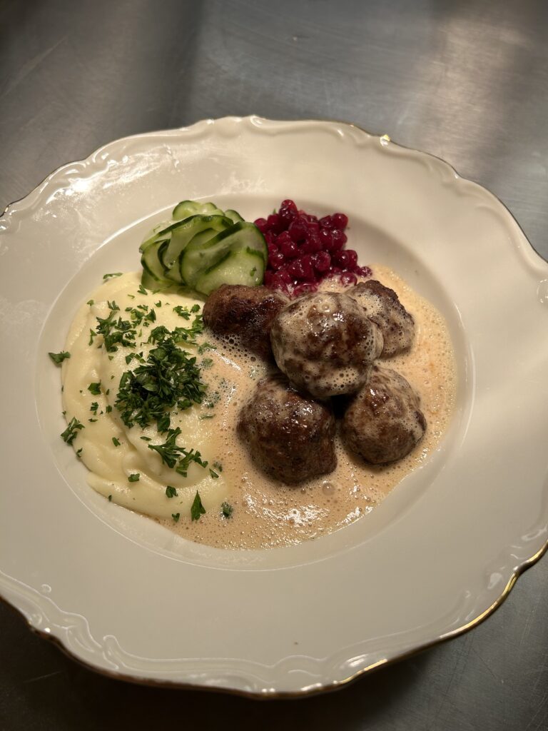 KÖTTBULLAR med potatispuré, gräddsås, pressgurka, lingon – 175 kr