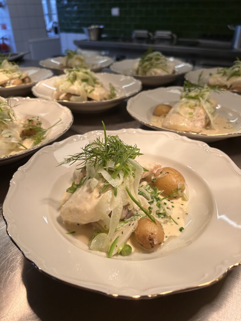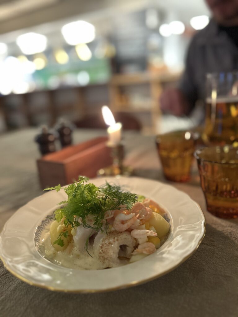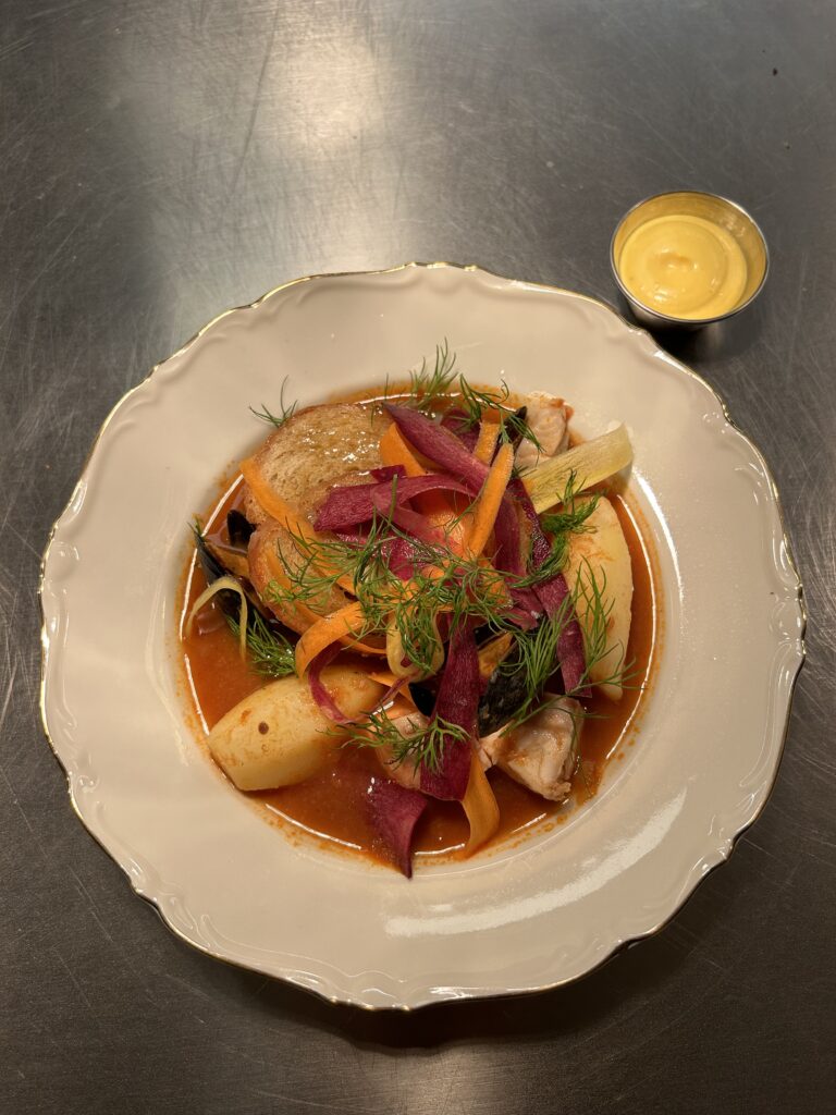 • Bouillabaisse med dagens fisk, räkor, aioli och honungskrutonger  – 275