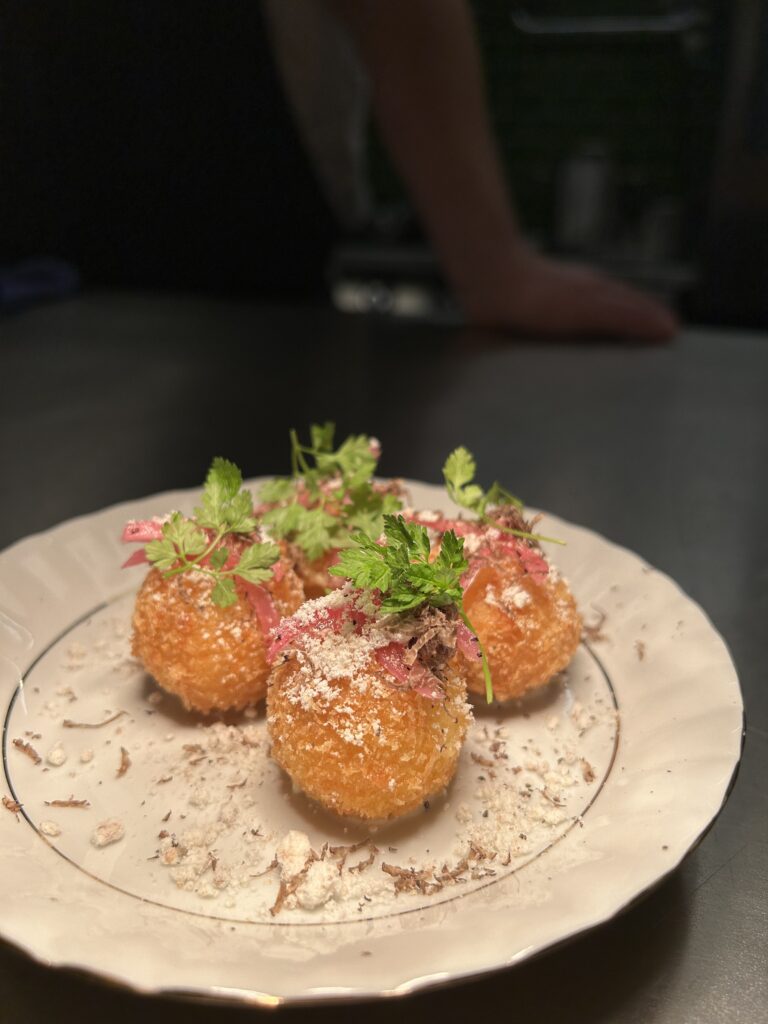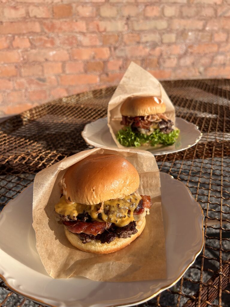 • Hamburgare 2x100g nötkött, ost, picklad jalapeño, rostad lök. Serveras med krispig potatis och tryffelmajo. Burgare går att få vegansk, vegetarisk eller glutenfri – 265