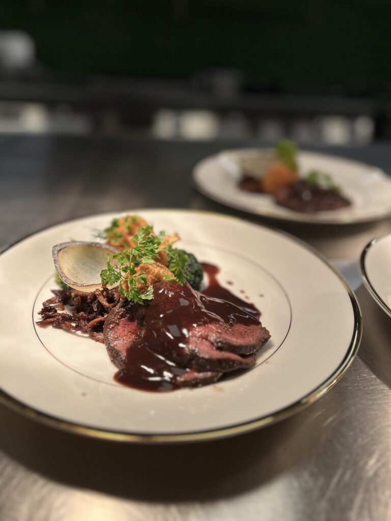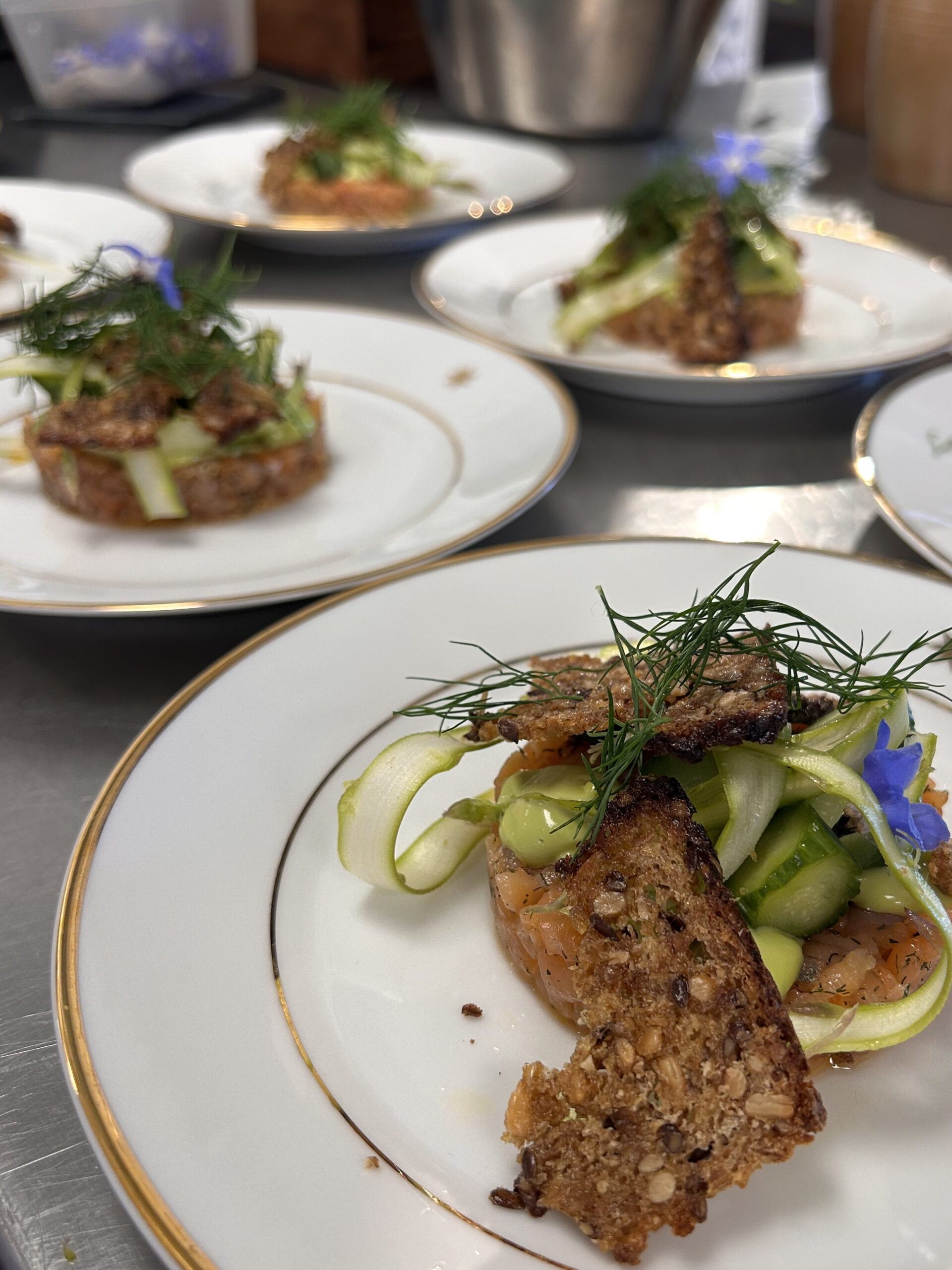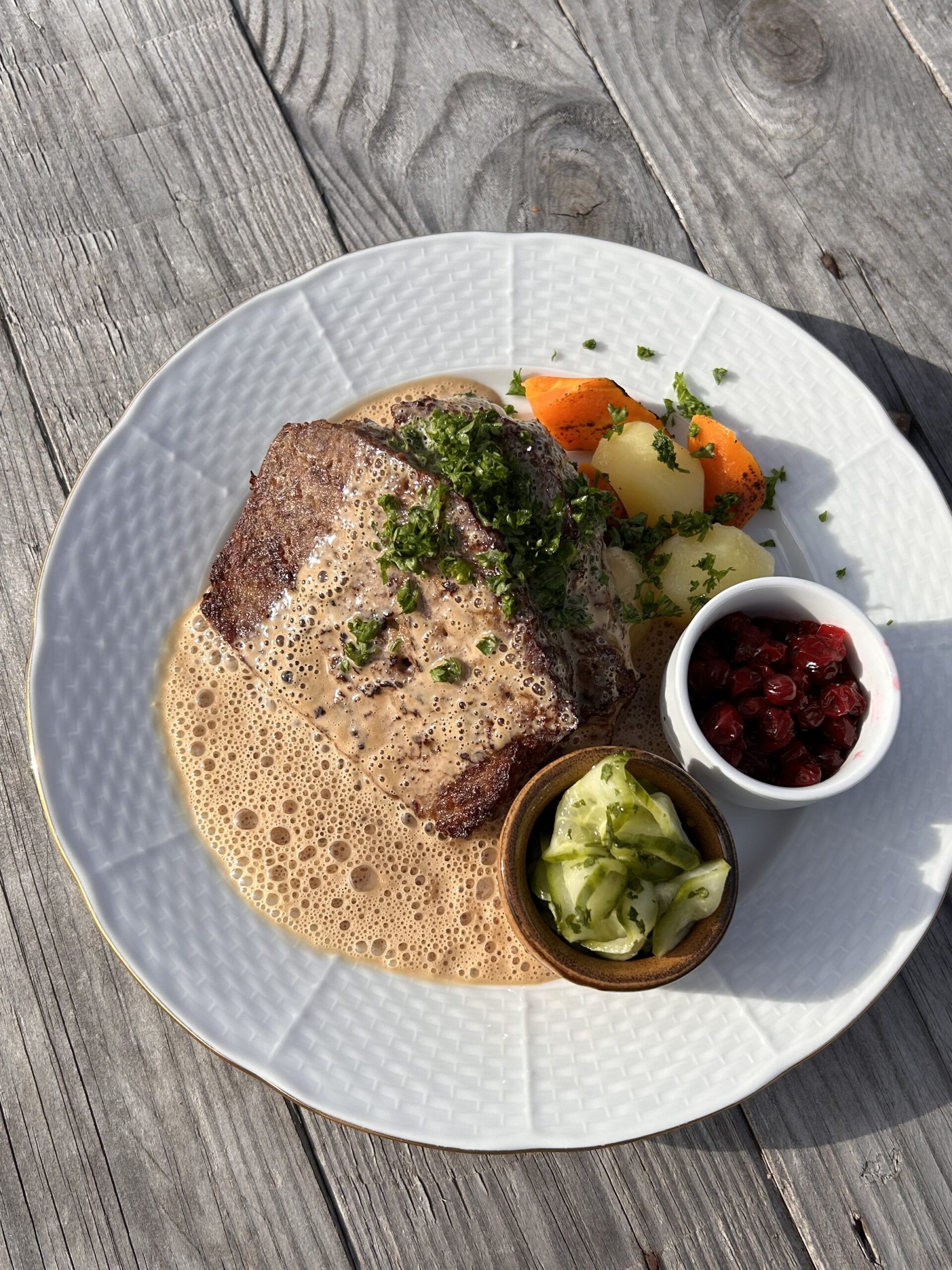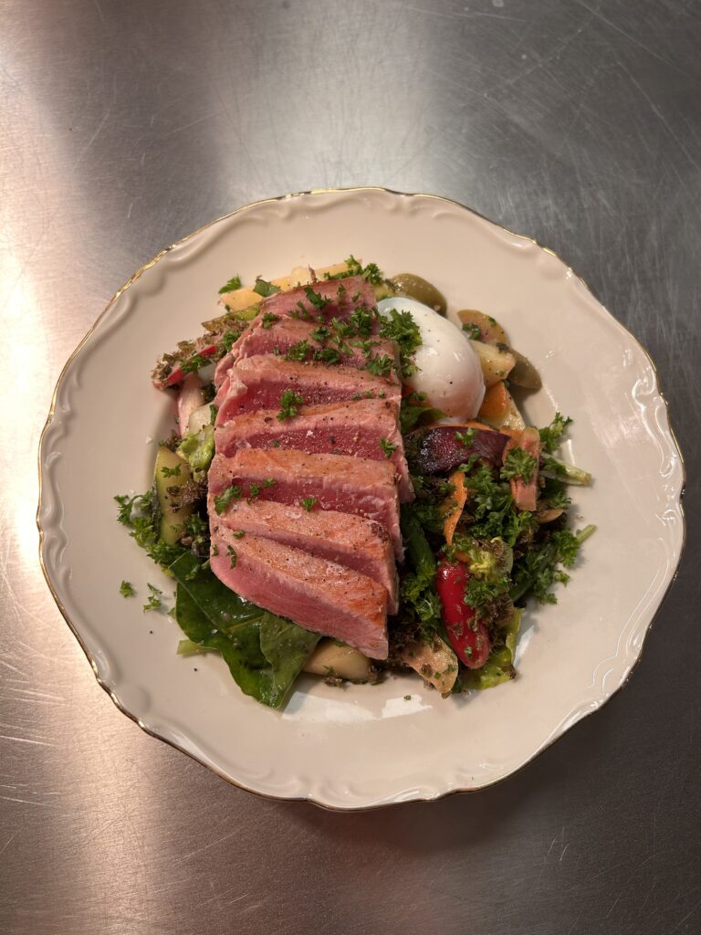 • Tartar på saltbakad rödbeta med örtemulsion, havgus(ost) och rostade hasselnötter – 150/245 (stor serveras med krispig potatis)